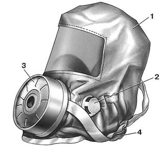 1 - капюшон со смотровой пленкой, 2 – клапан выдоха, 3 - фильтрующе-сорбирующий патрон, 4 – оголовье.