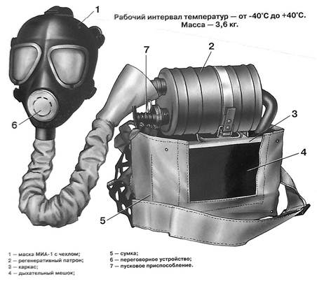 Изолирующие противогазы состоят из лицевой части, регенеративного патрона, дыхательного мешка и сумки. Кроме того, в комплект входят незапотевающие пленки и по желанию потребителя могут поставляться утеплительные манжеты.