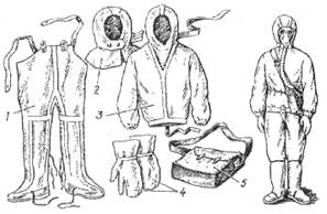 | Легкий защитный костюм Л-1 изготавливается из прорезиненной ткани. Состоит из брюк с защитными чулками (1), рубахи с капюшоном (3), двупалых перчаток (4) и подшлемника (2), в комлект входит сумка для хранения (5). Брюки сшиты вместе с чулками, заканчивающимися резиновой осоюзкой. К ним пришиты тесемки для крепления к ногам. В верхней части брюк имеются плечевые лямки и полукольца. |