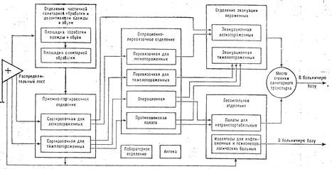 Госпитальное отделение. Оно предназначено для госпитализации и лечения нетранспортабельных пораженных (послеоперационных, агонирующих, а также имеющих тяжелую степень лучевой болезни) и изоляции. инфекционных и психически больных. В составе госпитального отделения развертываются палаты для нетранспортабельных пораженных и больных, изолятор для инфекционных больных, изолятор для психоневрологических больных, родильная.