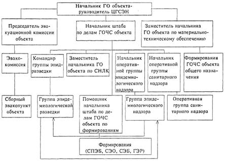 Организация и проведение санитарно-гигиенических и противоэпидемических мероприятий в общей системе ликвидации медико-санитарных последствий имеют весьма важное значение. Для обеспечения быстрого реагирования на базе ЦГСЭН и других учреждений санитарно-эпидемиологической службы создаются специализированные формирования. Для оперативного руководства и координации деятельности организаций и граждан по предупреждению массовых инфекционных заболеваний и отравлений людей и ликвидации последствий боевых действий местными органами исполнительной власти создаются постоянно действующие санитарно-эпидемиологические комиссии. В состав этих комиссий включаются руководители служб административной территории, а рабочим органом комиссии является штаб, который создается из работников служб ГОЧС, здравоохранения и противоэпидемических учреждений. В учреждениях, входящих в состав государственной санитарно-эпидемиологической службы (ЦГСЭН, научно-исследовательских институтах санитарно-гигиенического и эпидемиологического профиля, противочумных институтах и станциях и др.), для работы в ЧС создаются органы управления - штабы по делам ГОЧС объекта. Состав штаба определяется приказом начальника ГО объекта в зависимости от структуры учреждения, его возможностей и решаемых задач.