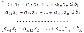 Задача об использовании ресурсов (задача планирования производства). Обозначим хj (j = 1, 2,..., п)– число единиц продукции Рj,запланированной к производству; bi (i = 1, 2,..., m) – запас ресурса Si; aij – число единиц ресурса Si, затрачиваемого на изготовление единицы продукции Рj (числа aij часто называют технологическими коэффициентами); сj – прибыль от реализации единицы продукции Рj. Тогда экономико-математическая модель задачи об использовании ресурсов в общей постановке примет вид: найти такой план Х = (х 1, х2, …, хп) выпуска продукции, удовлетворяющий системе