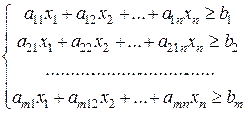 Задача составления рациона (задача о диете, задача о смесях). Обозначим хj (j = 1, 2,..., п)– число единиц корма п -го вида; bi (i = 1, 2,..., m) – необходимый минимум содержания в рационе питательного вещества Si; aij – число единиц питательного вещества Si в единице корма j -го вида; сj – стоимость единицы корма j -го вида. Тогда экономико-математическая модель задачи примет вид: найти такой рацион Х = (х 1, х 2, …, хп), удовлетворяющий системе