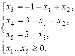 Очевидно, что сохранение неотрицательности всех переменных (допустимость решения) возможно, если не нарушается ни одна из полученных во всех уравнениях границ. В данном примере наибольшее возможное значение для переменной х 2 определяется как минимальное из полученных значений, т.е. х 2 = 5. При х 2 = 5 переменная х 5 обращается в нуль и переходит в неосновные.