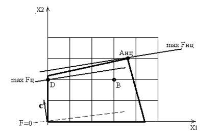 Оптимальным решением нецелочисленной задачи служит точка Анц. Как следует из рис. 4.1, точка В ближе всего к точке Анц в смысле округления. Но целой точкой, находящейся ближе всего к оптимальной линии уровня max Fнц, является точка D. Таким образом, попытка решить задачу с отброшенным условием целочисленности и последующим округлением полученного оптимального плана до ближайших целых значений не всегда состоятельна. С практической точки зрения подобный подход допустим в тех случаях, когда значения переменных, образующих оптимальное решение исходной задачи, достаточно велики и погрешностями округления можно пренебречь.