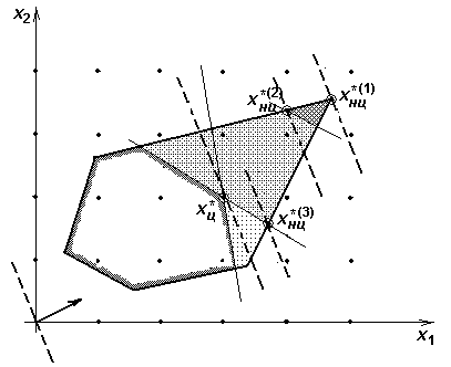 Для лучшего понимания существа вопроса обратимся к наглядной иллюстрации случая п =2 (рис. 4.2). Ограничения задачи определяют на плоскости некоторый многоугольник М, в вершине х *(1) которого, если не учитывать условия целочисленности, достигается максимум целевой функции. Внутри этого многоугольника имеется конечное множество точек, которым соответствуют решения с целочисленными значениями переменных (на рисунке они обозначены кружочками). На рисунке показаны три прямые, соответствующие трем дополнительным линейным ограничениям. Каждая из прямых отсекает часть области допустимых решений. Так, после отсечения части области прямой оптимальной оказывается вершина х *(2), затем х *(3), и, наконец, оптимальной становится целочисленная вершина х *.