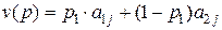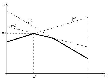 3. Из принципа минимакса следует, что надо взять нижнюю огибающую всех прямых, соответствующих стратегиям второго игрока (она показана на рисунке жирной линией), а на этой ломаной, обязательно обращенной выпуклостью вверх, надо найти вершину, имеющую максимальное значение v*. Абсцисса этой точки x * и будет искомым значением p 1 *.
