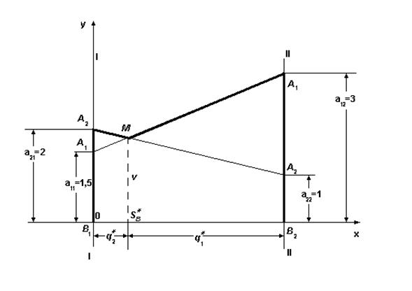 Если число стратегий одного из игроков равно двум, то для нахождения оптимальных стратегий можно легко воспользоваться графическим методом.