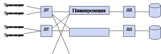 ДТ – диспетчер транзакции. Фиксирует начало и конец транзакции, передает информацию о четности планировщику.