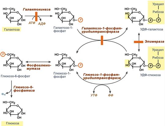 Галактоза сначала подвергается фосфорилированию по 1-му атому углерода. Отличительной особенностью является превращение в глюкозу не напрямую, а через синтез УДФ-галактозы из галактозо-1-фосфата. Источником УМФ является УДФ-глюкоза, заранее имеющаяся в клетке. Образованная УДФ-галактоза впоследствии изомеризуется в УДФ-глюкозу и далее ее судьба различна.