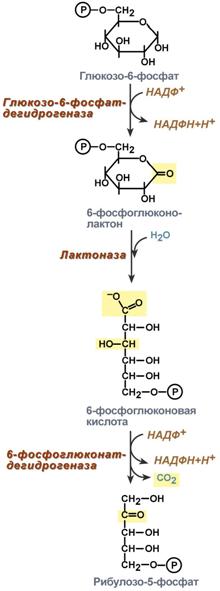 На первом, окислительном, этапе глюкозо-6-фосфат в трех реакциях превращается в рибулозо-5-фосфат, реакции сопровождаются восстановлением двух молекул НАДФ до НАДФН.