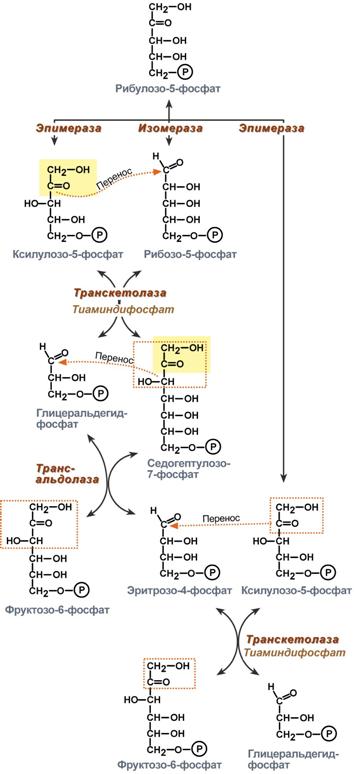 2 этап – этапструктурных перестроек, благодаря которым пентозы способны возвращаться в фонд гексоз. В этих реакциях рибулозо-5-фосфат изомеризуется до рибозо-5-фосфата и ксилулозо-5-фосфата. Далее под влиянием ферментов транскетолазы и трансальдолазы происходят структурные перестройки с образованием других моносахаридов. При реализации всех реакций второго этапа пентозы превращаются во фруктозо-6-фосфат и глицеральдегидфосфат.