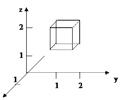 6. Построим прямое произведение трех числовых отрезков, например: [0,1] ´ [1,2] ´ [1,2]. Произведением первых двух отрезков является квадрат с вершинами (0,1), (0,2), (1,1), (1,2). Произведением полученного множества точек квадрата на числовой отрезок [1,3] является множество точек прямоугольного параллелепипеда (в данном случае куба), вершины которого точки: (0,1,1), (0,1,2), (0,2,1), (0,2,2), (1,1,1), (1,1,2), (1,2,1), (1,2,2).