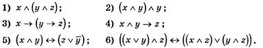 С помощью логических операций над высказываниями из заданной совокупности высказываний можно строить различные сложные высказывания. При этом порядок выполнения операций указывается скобками. Например, из трех высказываний х, у, z можно построить высказывания: