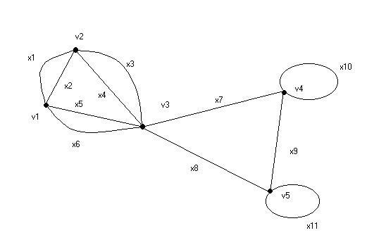 Удалим петли х10 и х11. Получим мультиграф. Выделим цикл v3x4x2x5v3 – обозначим m1. Удалим ребра x4, x2, x5. Снова выделяем цикл v3x3x1x6v3 - m2 . V(m1)ÇV(m2) = {v1, v2, v3}. Удалим ребра. Выделяем цикл v3x7x9x8v3 - m3. V(m2)ÇV(m3) = {v3}. В мультиграфе построили эйлеров цикл m1 + m2 + m3 . Добавим удаленные петли и получим цикл в заданном графе: v3x4x2x5 x3x1x6 x7 x10 x9 x11 x8v3.