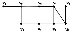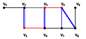 Из максимального паросочетания, например для вершины v2, построим минимальное реберное покрытие: не инцидентны вершины v1 и v8. Добавим ребра к М: {v1, v2}, {v8, v4}. Осталась не инцидентной вершина v9. Добавим в построенное реберное покрытие еще одно ребро {v9, v8}.