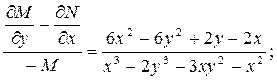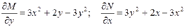 ▲ Установим, является ли исходное равнение уравнением в полных дифференциалах. Для этого проверим, выполняется ли условие Эйлера (3.5). Здесь