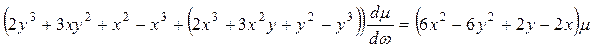 ▲ Это уравнение не является уравнением в полных дифференциалах. Найдем интегрирующий множитель, с помощью которого можно привести исходное уравнение к уравнению в полных дифференциалах.