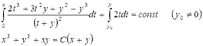 , приведем исходное уравнение к уравнению в полных дифференциалах. Его общий интеграл имеет вид: