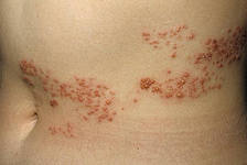 Клиническая картина характеризуется высыпанием сгруппированных пузырьков с прозрачным, мутным или геморрагическим содержимым, расположенных на фоне эритематозных пятен по ходу отдельных чувствительных нервов и сопровождающихся более или менее сильными невралгиями и регионарным лимфаденитом. В воспалительный процесс вовлекаются задние рога спинного мозга и ганглии. Боли нередко предшествуют кожным изменениям и при соответствующей локализации могут симулировать инфаркт миокарда, аппендицит, почечную колику и т.п. Наиболее частой является локализация поражений по ходу межреберных нервов. Характерно одностороннее, асимметричное поражение кожи. При последовательном высыпании множества герпетических очагов они сливаются в сплошную ленту и как бы опоясывают туловище (этим обусловлено название заболевания). В редких случаях опоясывающий лишай локализуется на слизистой оболочке полости рта.