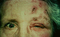 Опоясывающий герпес может проявляться в абортивной («папулезной») форме, а при слиянии везикул - в буллезной форме (пузыри, эрозии и корки имеют мелкофестончатые очертания). Тяжелой разновидностью заболевания является гангренозная (некротическая) форма, характеризующаяся образованием сгруппированных мелких струпов или сплошного черного струпа с мелкофестончатыми очертаниями. По заживлении остаются соответствующие по размерам рубцы. Особо тяжелым течением отличается гангренозный опоясывающий лишай, развивающийся в области разветвления 1-й ветви тройничного нерва - на коже лба, век, носа и височной области. При этом в процесс вовлекается глаз, что выражается слезотечением, светобоязнью, конъюнктивитом, иритом, язвенным кератитом, отслойкой сетчатки, геморрагическим выпотом в переднюю камеру глаза и заканчивается снижением зрения и даже слепотой.