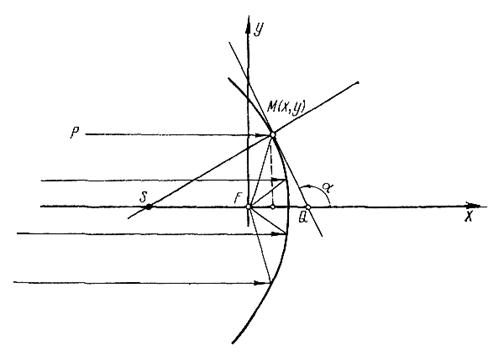 Луч Р падает в точку М поверхности зеркала и, отразившись, проходит через фокус F. В точке М проводим касательную, пересекающую ось абсцисс в точке Q, и нормаль, пересекающую ось абсцисс в точке S.