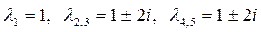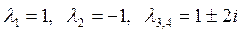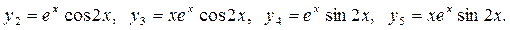 3. Мы видим, что среди корней характеристического уравнения есть как действительные и различные корни, так и комплексно сопряженные, причем комплексные корни являются кратными. Поэтому для составления фундаментальной системы линейно независимых решений воспользуемся правилами 1, 2 и 3. Корню