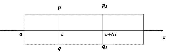 Пусть ось х совпадает с направлением оси стержня и пусть х – координата сечения pq, когда оно находится в покое. Поскольку мы изучаем малые продольные колебания стержня, то это значит, что внешние силы и силы инерции можно считать направленными вдоль оси стержня. Обозначим через u(x,t) смещение этого сечения в момент t. В рамках нашего предположения о том, что во время движения поперечные сечения остаются параллельными плоскости перпендикулярной к оси стержня, смещения в точке х+∆х будет