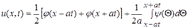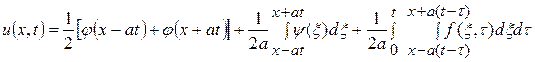 Это формула Даламбера, дающая решение задачи Коши для неоднородного волнового уравнения, описывающего вынужденные колебания однородной струны.