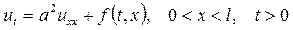 2. Рассмотрим следующую задачу. Определим закон распространения нестационарного температурного поля в тонком однородном стержне размером l, температура которого в начальный момент времени при t = 0 равна φ (х). При этом температура на торцах стержня изменяется: по закону μ(t) на конце x = 0 и по закону ν(t) на конце x = l. На стержень оказывают влияние внешние источники тепла по закону f(t,x). Сделаем математическую запись этой задачи: запишем исходное уравнение теплопроводности