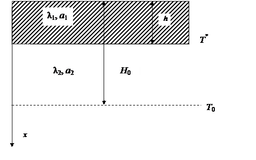 Сформулируем задачу: на поверхности полупространства в момент времени t =0 устанавливается отрицательная температура Тв, равная температуре внешней окружающей среды. В процессе промерзания связной породы образуется промерзший слой переменной толщины h = f (t). Нижняя граница этого слоя всегда имеет температуру замерзания влаги Т*. На этой границе происходит фазовый переход «вода-лед», при котором выделяется теплота перехода Lф, Дж/кг. На глубине залегания нейтрального слоя Н0 температура всегда постоянна и равна примерно 277 К (4°С). Обозначим эту температуру через Т0. Кроме этого, условимся обозначать в этой задаче параметры промерзшей связной породы — индексом 1 и талой — индексом 2.