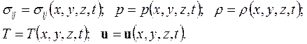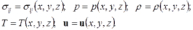 Каждая точка среды характеризуется параметрами: давлением р, плотностью ρ, температурой Т, u — вектором скорости c проекциями на оси координат (ux, uy, uz). Следует заметить, что в жидкости и газе р одинаково по всем направлениям (закон Паскаля), а в металлах, и вообще в твёрдых телах, в точке вместо р вводится тензор напряжений