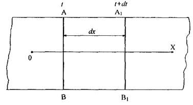 Выведем теперь дифференциальное уравнение распространения в отдельности упругих возмущений малой амплитуды. Рассмотрим слой толщиною dx в зоне возмущения (см. рис. 20.1). На этот слой слева (сечение АВ)действует напряжение σ, а справа (сечение А 1 В 1)— напряжение σ + dσ.