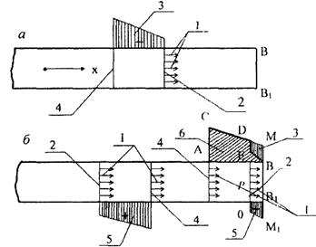 Рис. 20.2. Схема отражения плоской волны от свободной поверхности: а — импульс сжатия, падающий на торец отдельности ВВ; б— процесс отражения импульса сжатия от свободного торца ВВ] отдельности: / — направления скоростей частиц; 2 — передний фронт уже отразившейся части импульса; 3 — эпюра ACDMB падающего импульса напряжений; 4 — концевой фронт напряжений; 5 — эпюра В\М\ОР отраженного импульса напряжений (растяжения); б — эпюра ACDEB результирующего импульса напряжений