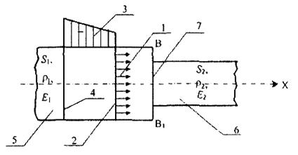 Пусть в левой отдельности с параметрами S 1; ρ 1; Е 1 распространяется слева направо импульс напряжений σn, εn, vn к плоскости плотного контакта этой отдельности со второй отдельностью с параметрами S 2; ρ 2; Е 2.Примем, что плоскость их контакта перпендикулярна к осям обеих отдельностей. В момент выхода импульса напряжений на плоскость плотного контакта ВВ 1произойдет частичное преломление и частичное отражение падающего импульса. При этом вследствие различий площадей поперечных сечений отдельностей вблизи поверхности контакта в обеих отдельностях будут формироваться сложные напряженно-деформированные состояния. Пренебрегая этими процессами, в отдельностях около их контактирующих торцов будем считать, что и в рассматриваемом случае справедлива изложенная выше теория Сен-Венана. Полученные в этом случае результаты, за исключением концевых зон и начальных участков прошедшего и отраженного импульсов, практически будут совпадать с точным решением, полученным на основе трехмерной волновой теории, если S 1 существенно не отличается от S 2.