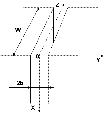 Для моделирования переноса радиоактивности по трещине была выбрана известная модель D.Tang и его коллег [6], так называемая модель одиночной трещины (рис.23.2). Приведенная ниже система уравнений (23.26)- (23.29) записана при следующих предположениях по геометрии и гидравлическим свойствам физической системы (рис. 23.3):