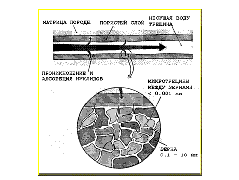 - некоторая часть радионуклидов диффундирует в микропоры матрицы породы вследствие различий концентрации на границе раздела трещина-матрица;