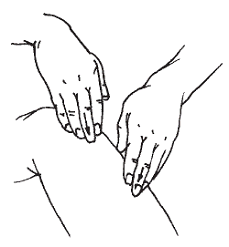 При локализации бурсита в области коленного сустава массируют мышцы бедра, область надколенника. Используются следующие приемы: поглаживание, спиралевидное растирание (рис. 19), разминание, надавливание, сдвигание, растяжение, непрерывистую вибрацию. Затем производят массаж мышц голени. После чего массируют коленный сустав. Выполняют несколько пассивных и активных движений.