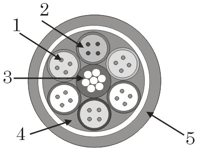 1 - оптическое волокно; 2,4- заполнитель; 3 - центральный силовой элемент (стальной трос); 5 - защитная оболочка