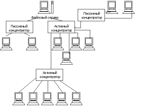 Специальной формой кольцевой топологии является логическая кольцевая сеть. Физически она монтируется как соединение звездных топологий. Отдельные звезды включаются с помощью специальных коммутаторов (англ. Hub – концентратор), которые по-русски также иногда называют “хаб”. В зависимости от числа рабочих станций и длины кабеля между рабочими станциями применяют активные или пассивные концентраторы. Активные концентраторы дополнительно содержат усилитель для подключения от 4 до 16 рабочих станций. Пассивный концентратор является исключительно разветвительным устройством (максимум на три рабочие станции). Управление отдельной рабочей станцией в логической кольцевой сети происходит так же, как и в обычной кольцевой сети. Каждой рабочей станции присваивается соответствующий ей адрес, по которому передается управление (от старшего к младшему и от самого младшего к самому старшему). Разрыв соединения происходит только для нижерасположенного (ближайшего) узла вычислительной сети, так что лишь в редких случаях может нарушаться работа всей сети.