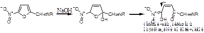 1. В качестве групповой реакции на нитрофурановую группировку в молекулах данных соединений характерна реакция с растворами щелочей. Характер окраски зависит от строения заместителя в положении 2. У некоторых соединений она появляется лишь в сильно щелочной среде или при нагревании, у других – на холоду. Предполагают, что окраска обуславливается раскрытием фуранового цикла с образованием сильно окрашенного аниона: