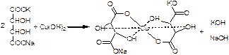 CuOH + кислая Калиевая соль винной кислоты + кислая Натриевая соль винной кислоты + кислота из альдегида + 2H2O