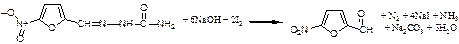 1. При нагревании с раствором щёлочи наблюдается бурое окрашивание, что связано с наличием в молекуле фуразолидона легкогидролизуемого оксазолидонового цикла. Добавление щёлочи приводит к разрыву кольца с образованием растворимого в воде окрашенного соединения: