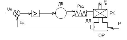 Функциональная схема одного из возможных регуляторов давления представлена на рис.11 и включает в себя задающую часть в виде в виде напряжения U0, элемент сравнения, усилительно-преобразовательное устройство, исполнительный двигатель Дв, регулирующий клапан РК, связанный с валом исполнительного двигателя через редуктор и шток с червячной передачей, объект регулирования ОР (например, котел или часть трубопровода), а также датчик давления ДД, являющийся датчиком обратной связи.
