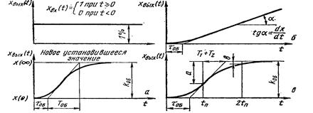 Коэффициент передачи kо представляет собой изменение выходной величины объекта при переходе из начального в новое установившееся состояние. Постоянная времени объекта То — это условное время, в течении которого выходная величина изменилась бы от начального до нового установившегося значения, если бы это изменение происходило со скоростью, постоянной и максимальной для данного переходного процесса. Постоянная времени характеризует инерционность объекта.