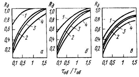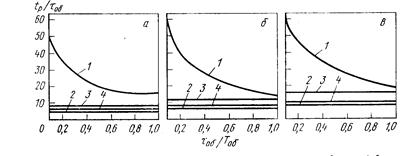 рис.4. Относительное время регулирования на статических объектах: а – апериодический процесс; б - 20%-ное перерегулирование;в – процесс с min ; 1- И-регулятор; 2 - П-регулятор; 3 - ПИ-регулятор; 4 - ПИД-регулятор. | |