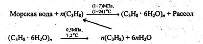 В газовых гидратах в полостях кристаллов льда могут находиться молекулы, размеры которых лежат в пределах 0,38 ÷ 0,92 нм (N2, О2, СгН4, С02, Сl2, Аг, Хе, Н2S, СH4, Вг2 иди др.). Например, известны клатраты примерного состава СН4.6Н2О, в которых на 46 молекул воды имеется 8 полостей, занятых молекулами метана.