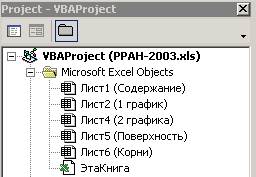 Окно проекта Project – VBA Project(рис. 1) показывает структуру вашего проекта (файла). Это окно активизируется в редакторе VBA выбором команды View Þ Project Explorer или кнопкой «Project Explorer» или нажатием клавиш Ctrl +R