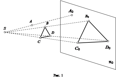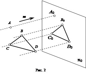 При этом точка A 0 называется проекцией точки A на плоскости p0. Проекцией фигуры называется совокупность проекций всех ее точек на выбранную поверхность проецирования (например, на рис. 1 проекцией треугольника BCD на плоскости p0 является треугольник B 0 C 0 D 0). Описанный метод проецирования путем проведения проецирующих прямых через точки заданной фигуры и центр проецирования, называется центральным.