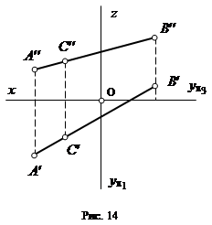 Если на прямой АВ мы выберем какую- либо точку С, то проекции этой точки будут лежать на одноименных проекциях прямой (рис. 14).